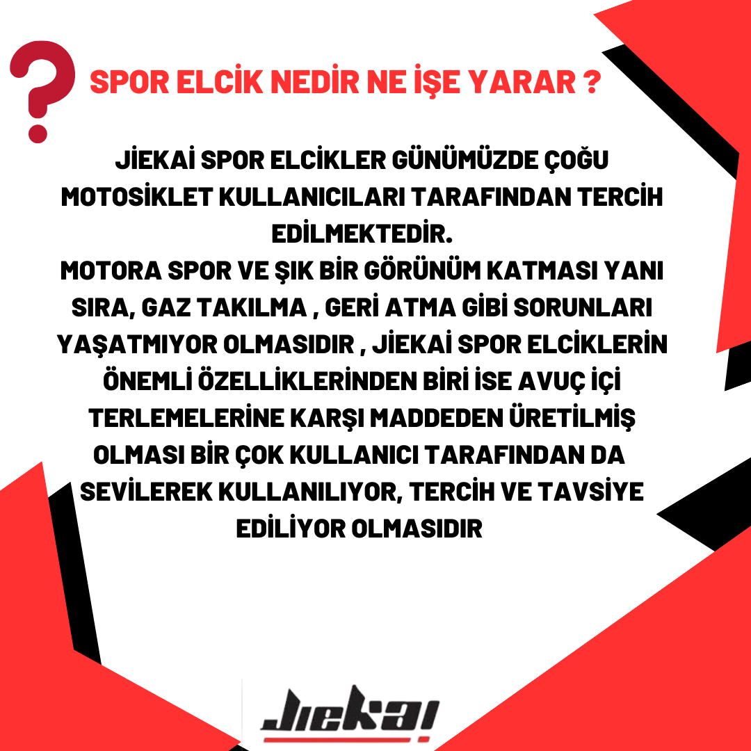 JİEKAİ SPOR ELCİKLER GÜNÜMÜZDE ÇOĞU MOTOSİKLET KULLANICILARI TARAFINDAN TERCİH EDİLMEKTEDİR. MOTORA SPOR VE ŞIK BİR GÖRÜNÜM KATMASI YANI SIRA, GAZ TAKILMA , GERİ ATMA GİBİ SORUNLARI YAŞATMIYOR OLMASIDIR , JİEKAİ SPOR ELCİKLERİN ÖNEMLİ ÖZELLİKLERİNDEN BİRİ İSE AVUÇ İÇİ TERLEMELERİNE KARŞI MADDEDEN ÜRETİLMİŞ OLMASI BİR ÇOK KULLANICI TARAFINDAN DA SEVİLEREK KULLANILIYOR, TERCİH VE TAVSİYE EDİLİYOR OLMASIDIR